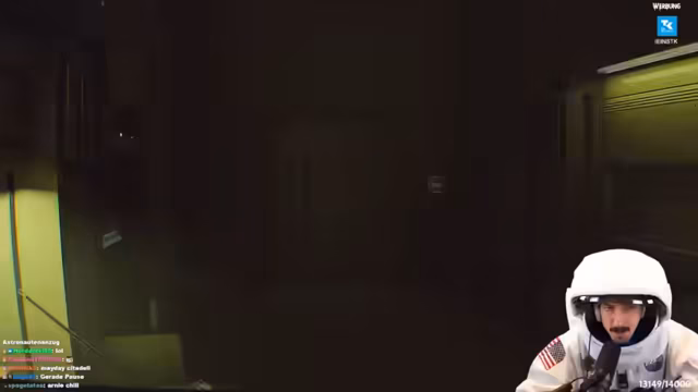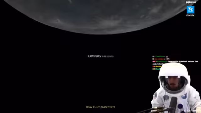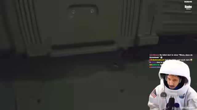 02:42:46Der Stream beginnt mit der unkoordinierten und zermürbenden Montage von Raumanzügen. Die Protagonisten beschweren sich über die unflexible Materialbeschaffenheit, insbesondere das Klettverschlussmaterial und die sperrigen Handschuhe, die präzises Arbeiten wie das Tragen eines Helms und die Bedienung der Tastatur unmöglich machen. Nach vielversprechenden Tönen im Bezug auf die Soundkulisse startet der Streamer das Spiel Dead Space, das auf einer Raumstation spielt, und äußert seine anfängliche Begeisterung für das düstere, ungeschnittene Horrorspiel.