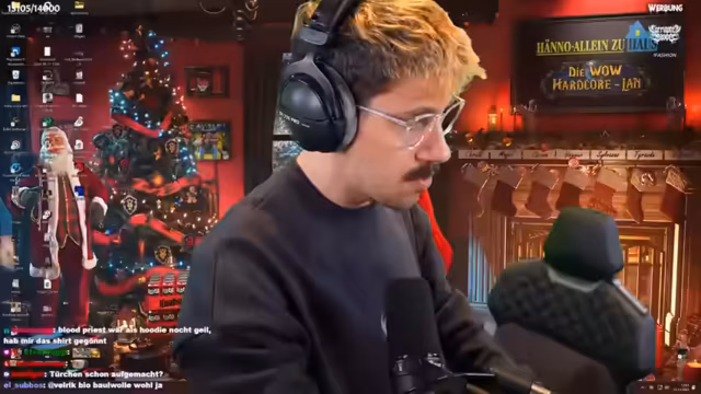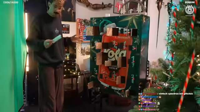 00:25:31Als Teil eines Türchen-Advents-Kalenders wird ein Rätsel vorgelegt. Der Streamer sucht nach einem Hinweis, der unter einem Gegenstand versteckt sein soll, an dem das Geld lange ruht. Währenddessen treten diverse technische Störungen auf. Ein geöffneter Versandkasten steht unter Wasser, ein Testaufbau mit Greenscreen wird inspiziert und auch die Studio-Software wie OBS und Discord bereiten Schwierigkeiten, was die Rätsellösung verlangsamt und unterbricht.