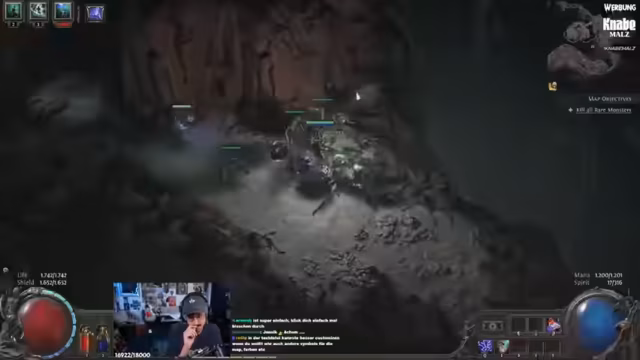 05:41:48Zu Beginn des Streams konzentriert sich der Streamer auf das Gameplay in Path of Exile. Er beschreibt seine Erlebnisse in verschiedenen Räumen, wobei er stets versucht, seine Ehre zu bewahren und Risiken einzugehen. Dabei kommt es zu mehreren kritischen Situationen, in denen er knapp dem Tod entgeht, etwa durch Minen oder Skelette. Er betont, dass er primär für die Herausforderung spielt und nicht primär für den Beuteertrag.