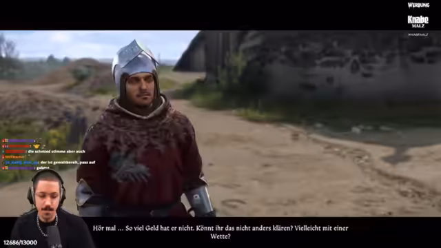 05:13:17Der Streamer spricht mit Frido Schkumel über eine Sponsoring für das bevorstehende Turnier in Kuttenberg. Er bietet an, die Schmiedegilde als offiziellen Unterstützer zu bewerben, um Kunden und Ansehensbonus zu generieren. Frido ist anfangs skeptisch, zeigt sich aber interessiert, als der Streamer ihm einen finanziellen Ausgleich für die Kosten anbietet.