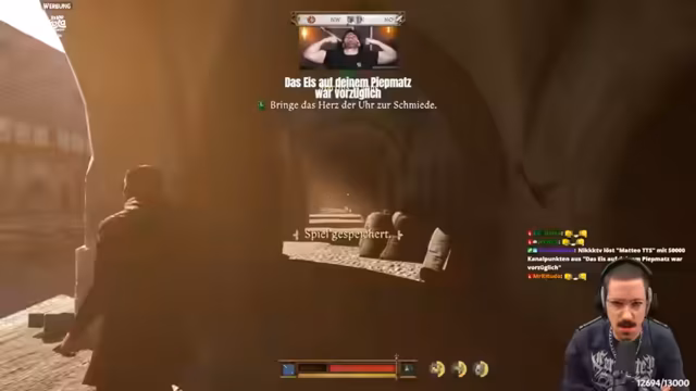 05:35:42Der Streamer trifft Heinrich im Rathaus, um mehr über die mysteriöse Uhr zu erfahren. Heinrich schildert die Geschichte, bei der die Gilde der Uhrmacher versagt hat und die Bauteile der Uhr gestohlen wurden. Er vermutet, dass ein Italiener namens Fabrizio de Dondi mit den Plänen verschwunden ist und schlägt vor, diesen zu finden, um das Rätsel zu lösen. Diese neue Mission wird zum nächsten großen Ziel.