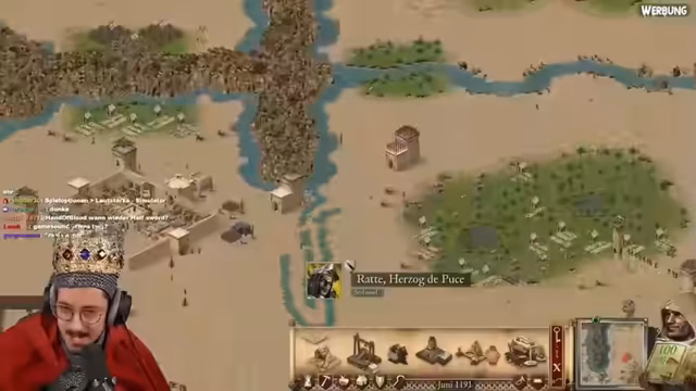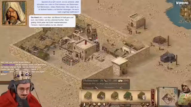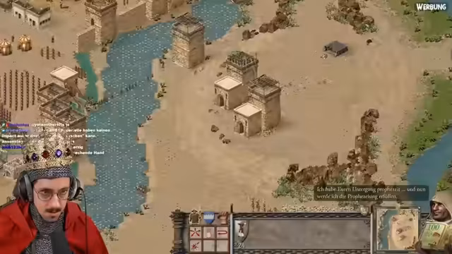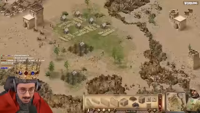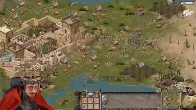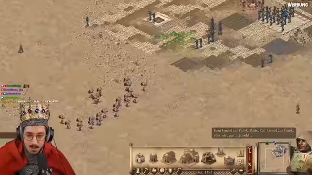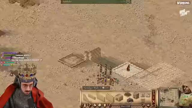 03:30:25Der Streamer begrüßt die Zuschauer zu einer neuen Koop-Mission in Stronghold Crusader Definitive Edition. Er stellt fest, dass beide Spieler über alle benötigten Ressourcen wie Stein, Eisen, Bäume und Nahrung verfügen. Die Karten sind winzig, was die Navigation und Verteidigung erschwert, und der Streamer plant direkt einen Angriff, während er gleichzeitig seine Basis mit Häusern und Wirtschaftsgebäuden erweitert.