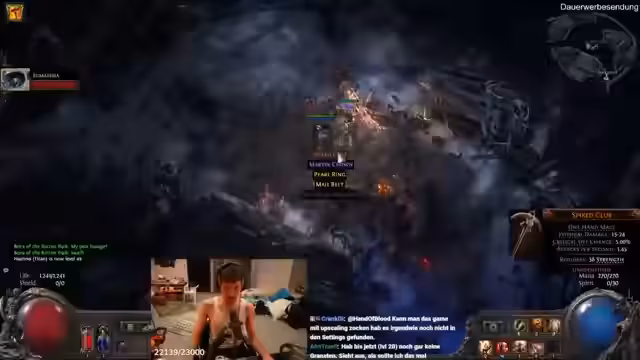 17:08:04Der Stream konzentriert sich auf die Verbesserung des Hauptcharakters im Spiel. Es wird intensiv über den Gebrauch verschiedener Orb-Arten diskutiert, wie Greater Essence of Torment, Regal Orb und Iron Runes, um Items zu optimieren. Das Ziel ist, bestehende Modifier zu verbessern oder neue, leistungsstärkere Modifier hinzuzufügen, insbesondere physischen und Feuerschaden. Der Streamer experimentiert mit verschiedenen Kombinationen, um die maximale Schadensausbeute für seinen Zweihänder-Streitkolben zu erreichen, und stellt dabei beeindruckende Schadenswerte fest.