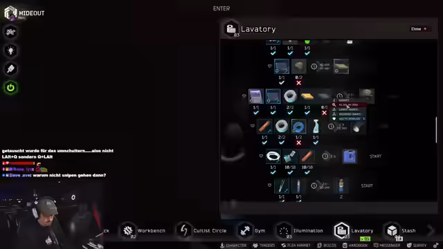 08:42:57HandOfBlood und Nico sind frustriert über eine Tarkov-Session, in der sie von einer großen Anzahl Scavs überrannt wurden und am Ende von einem PMC getötet wurden. HandOfBlood beschwert sich über die hohe Anzahl an Scavs und vermutet, dass das Spiel abgekatert ist. Er hat kein Geld mehr und schlägt eine Scav-Runde vor, gefolgt von einer Kaffeepause. HandOfBlood erklärt, dass er bei einem bestimmten Gebäude immer von vielen Scavs angegriffen wird. Er startet eine Scav-Runde und findet eine M870. Er sucht im Menü nach der Option für Schulterwechsel. Sie sind im Café gespawnt und HandOfBlood plant, direkt rauszugehen. Er wird von einem Sniper getötet und beschwert sich über die unfaire Situation. Er kündigt eine Budget-Runde an und kauft einen Bohrapparat und Vaseline. Er hat Probleme, die Ausrüstung in seiner Weste zu verstauen und entscheidet sich für eine günstigere Option.