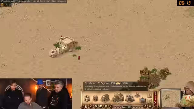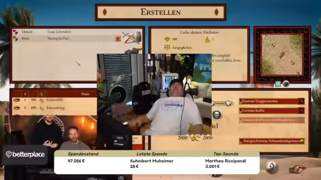 01:13:50Niklas beginnt sein Stronghold-Spiel gegen die Ratte, während die anderen ihn mit Kommentaren und (wenig hilfreichen) Tipps begleiten. Es wird eine Stoppuhr eingeblendet, um die überlebten Minuten zu zählen, die in Spenden umgerechnet werden. Niklas kämpft mit grundlegenden Spielmechaniken wie dem Bau von Gebäuden, der Ressourcenverwaltung und der Steigerung der Beliebtheit seiner Bevölkerung. Die anderen Spieler amüsieren sich über seine Schwierigkeiten und die scheinbare Inaktivität der Ratte. Trotz der Herausforderungen und der mangelnden Erfahrung von Niklas, der sich an ein früheres verlorenes Spiel gegen Moritz Weber erinnert, steigt die Spendensumme stetig an. Die Zuschauer im Chat sind ebenfalls gespalten über Niklas' Leistung. Die Ratte greift lange Zeit nicht an, was zu Spekulationen über ihre Taktik führt.