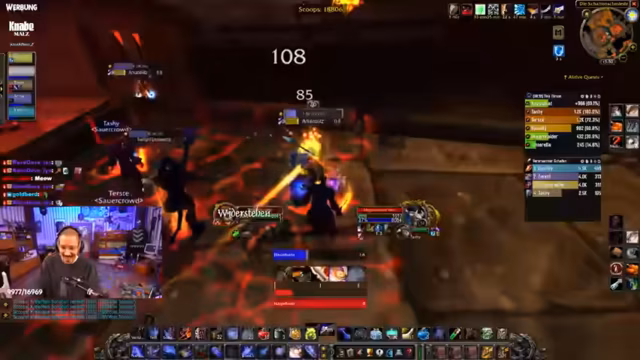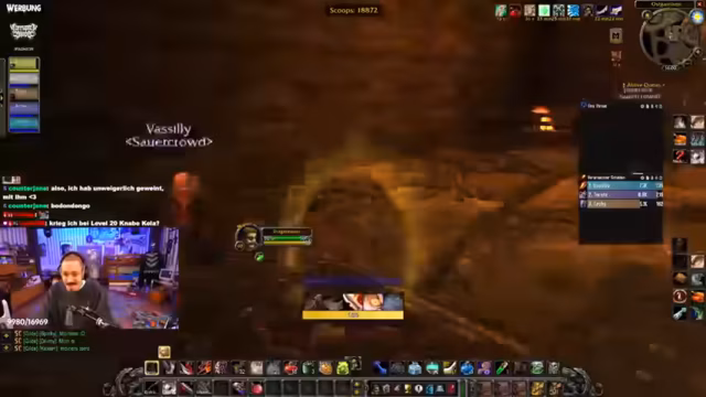 03:13:02Der Streamer befindet sich in einer äußerst gefährlichen Situation innerhalb des Blackrock Depths. Während eines Zugs stirben Gruppenmitglieder mehrfach durch einen Boss namens 'General Zornes', was zu chaotischen und sarkastischen Kommentaren führt. Der Spieler mit dem Namen 'Vasily' ist besonders betroffen und stirbt permanent, was den Streamer dazu bringt, Ausrufe wie 'Jeden scheiß Tag, kommt der alle 40 tot' zu äußern. Trotz der komplexen Lage versucht der Streamer, die Gruppe zu koordinieren, und denkt an einen Fluchtweg, falls etwas schiefläuft. Die Atmosphäre ist geprägt von Stress, humorvollen Kommentaren und der Notwendigkeit, schnell zu reagieren, um den Widerstand gegen die Bossgegner zu überstehen.