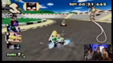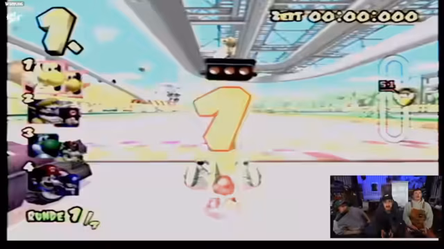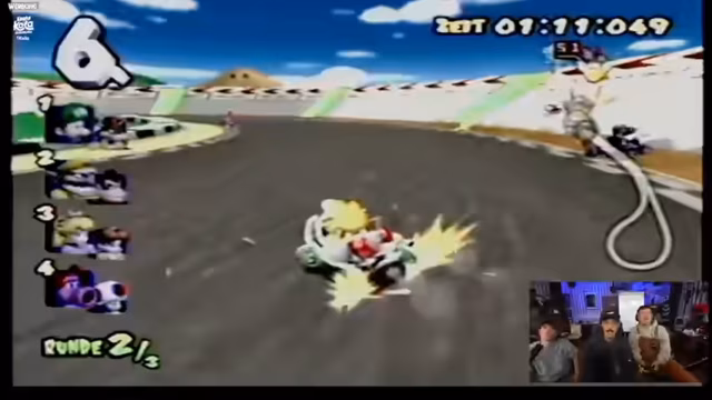 04:42:21Die Teilnehmer starten intensiv in die Mario Kart Double Dash Challenge mit aufregenden Driftmanövern und strategischem Wechsel der Charaktere. Es kommt zu temporeichen Verfolgungsjagden und Platzierungswechseln auf der Rennstrecke. Die Teilnehmer sind hochkonzentriert und kommuniziert permanent über die Tastenbelegung und Wechselfunktionen während des Rennens. Die Spannung steigt, da Positionen ständig wechseln und Items wie Pilze und Bananen eine wichtige Rolle spielen.