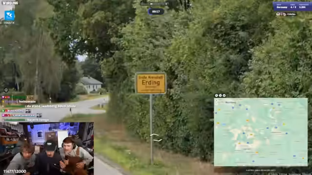 00:00:54Für das Geoguesser-Spiel erhalten die Streamer Tipps vom ehemaligen Weltmeister Cody, der ihnen im Discord zur Seite steht. Die Strategie besteht darin, aus den Dörfern herauszufahren und nach Ortseingangsschildern zu suchen, die Landkreise anzeigen. Die Streamer erkennen anfangs Schwierigkeiten mit der Bedienung, verbessern sich jedoch durch weiteres Üben und Coaching von Cody.