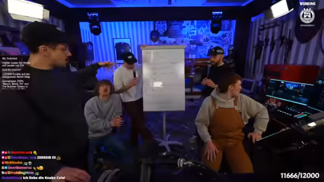 00:19:11Für den Schach-Wettkampf wird ein großes Schachbrett aufgestellt, mit Figuren in der Größe von Ronny. Die Streamer könnten theoretisch stärkere Gegner bekommen, wenn sie Spieler mit besserer Bewertung einladen. Für das Quiz werden drei Joker vorbereitet: zwei Publikumsjoker und ein Telefonjoker, den die Streamer selbst wählen können. Die Quizfragen basieren auf einem bekannten deutschen Multiple-Choice-Format.
