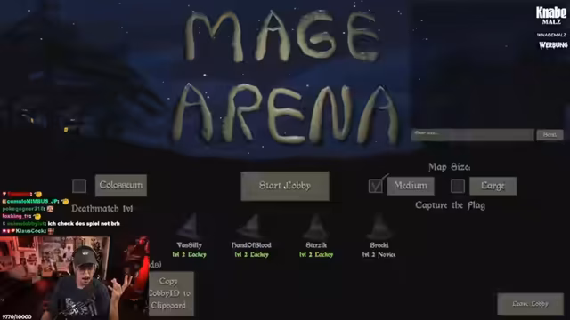 00:00:00Der Stream beginnt mit dem Einstieg in das Spiel Mage Arena. Der Streamer erklärt den Mechanismus des Spiels: es ist ein Ego-Shooter, bei dem man als Magier Zaubersprüche durch Sprachbefehle, wie 'Fireball', castet. Das Spiel ist PvP-basiert und er zusammen mit den Zuschauern Brücki, Sterzig und Vasily spielt. Man spielt entweder die Fraktion der Sorcerers oder der Warlocks. Der Streamer entscheidet sich für Warlocks und die Gruppe erstellt eine private Lobby.