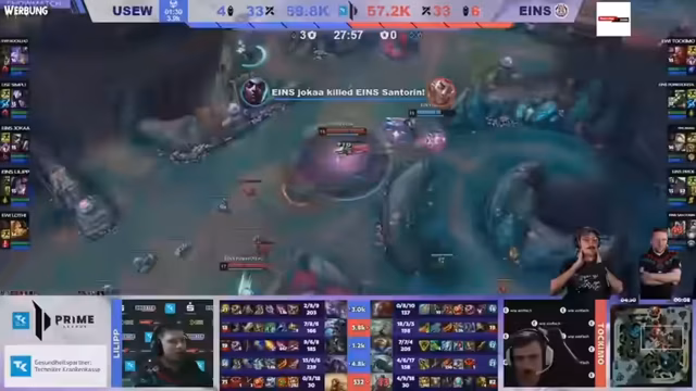 06:27:35Das Showmatch wird detailliert analysiert und kritisch kommentiert. Fokus liegt auf den individuellen Leistungen und den Fehlern der Spieler. Besonders Tristan Schrages Spielweise als Master Yi wird intensiv hinterfragt, da er vermeidbare Chancen und Fails zeigt. Sein ungewöhnlicher Champion-Pick wird ebenfalls diskutiert. Der Streamer äußert seine Frustration über das bunte, aber strategisch fragwürdige Teamkomp und die unprofessionellen Overlay-Probleme der Produktion.