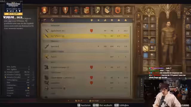 08:31:55Nach dem nächtlichen Abenteuer kehrt der Streamer in das Dorf zurück, um seine überfüllte Tasche zu entlasten. Er verkauft beim Schneider überflüssige Ausrüstungsgegenstände und verdient sich ein ansehnliches Geld hinzu. Er zeigt sich begeistert von seiner Ausrüstung, insbesondere dem neu erworbenen Kettenhemd, das seinen Charisma-Wert erhöht. Zum Ende des Streams ist er voller Tatendrang und signalisiert, dass er am nächsten Tag möglicherweise weiter streamen wird, da er großen Spaß am Spiel hat.
