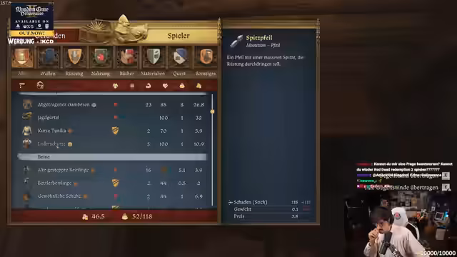 01:00:16Während des Gameplays erzählt der Streamer aus der Vorgeschichte seines Charakters 'Heinrich'. Er erinnert sich an einen Überfall, bei dem sein Freund 'Hans' von einem Pfeil im Hintern getroffen wurde. Dieser Vorfall führte dazu, dass sie gemeinsam Burg Talenberg verteidigen mussten. Der Streamer unterbricht seine Erzählungen mehrfach durch technische Probleme mit dem Streaming-Software OBS, die ihn erneut in Rage versetzen.