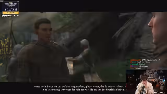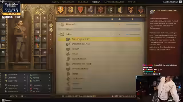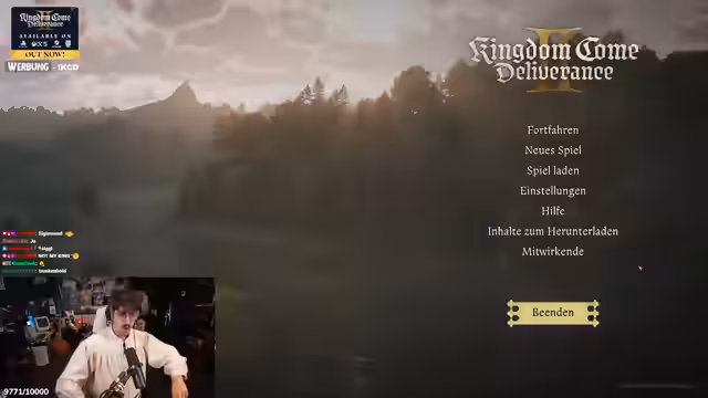 00:11:25Nach längerer Unterbrechung wegen technischer Probleme startet der Streamer endgültig ins Spiel ein. Er steckt in den Tutorials von 'Kingdom Come Deliverance 2', kämpft gegen einen Banditen und wird von der Kräuterhexe 'Pavlena' geheilt. Er erkennt an, dass er für YouTube-Videos bereits vorab Teile des Spiels aufgenommen hatte, und gab dabei einen Ausblick auf seine Spielziele: Eine maximale Bereicherung und der Kampf gegen Banditen, um deren Klamotten zu erbeuten und sich heftige Ausrüstung zu besorgen.