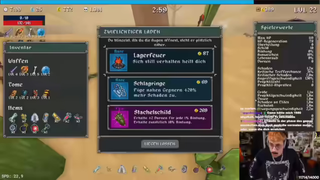 02:48:16Der Streamer startet das Gameplay mit der Challenge 'Fragil', bei der der Charakter stirbt, wenn er Schaden nimmt oder einen Gegner berührt. Zusätzlich wird der Turbo-Modus aktiviert, um schnell viele Items zu sammeln, bevor die Gegner zu stark werden. Der Truhenpreis ist reduziert, aber das Gegner-Scaling erhöht. Es wird entschieden, keine Gegner zu berühren, um nicht immer schneller zu werden. Zu Beginn werden viele Throne genommen und auf Glück für Items gesetzt, wobei direkt unpassende Items gebannt werden. Ziel ist es, eine Vielzahl an Projektilen und Flächeneffekten zu erhalten. Der Streamer entscheidet sich für mehr Waffen und wählt Feuerstab und Katana. Anschließend wird der Fokus auf Schreine und Rüstung gelegt, wobei die No-Hit-Challenge mit Ninja gespielt werden soll. Birdo wird als perfekt für No-Hit angesehen, aber der Streamer hat noch nicht viel freigeschaltet und konzentriert sich auf Anvil. Er benötigt Schlüssel und eine Mikrowelle. Die Challenger gilt als geschafft, wenn der Endboss von Stage 1 besiegt ist. Es wird überlegt, wann die Challenger geschafft ist und die großen Basen als entscheidend angesehen. Ein Doppel-Gift oder sogar Dreifach-Gift wird angestrebt, aber der Streamer ist zu schnell und darf nicht gehittet werden. Attack-Speed soll gebannt werden.