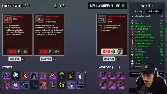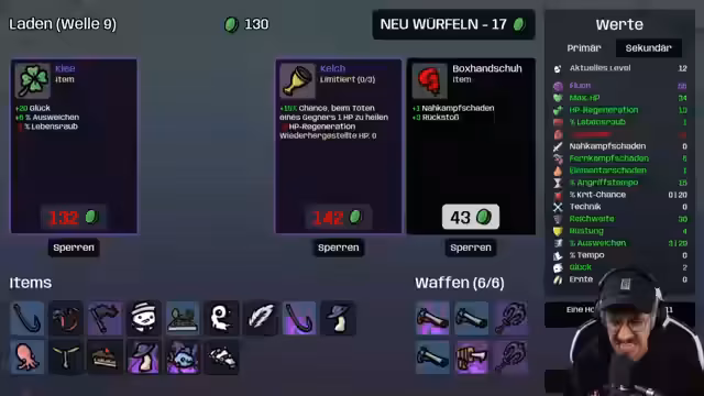 02:12:41Im Endgame konzentriert sich der Streamer darauf, seine Statistiken an ihre absoluten Grenzen zu bringen. Er erreicht eine enorme Menge an Glück (226), was seinen Kritisch-Treffern zu Glück umwandelt, und eine unglaubliche Lebensregeneration (138), die seine eigentlichen Lebenspunkte (133) übersteigt. Items wie die Roboterarme werden mehrfach verflucht, und die Jagd nach Perlen in Truhen beginnt, um seinen Schaden weiter zu steigern und eine einzigartige und mächtige Endgame-Konfiguration zu schaffen.
