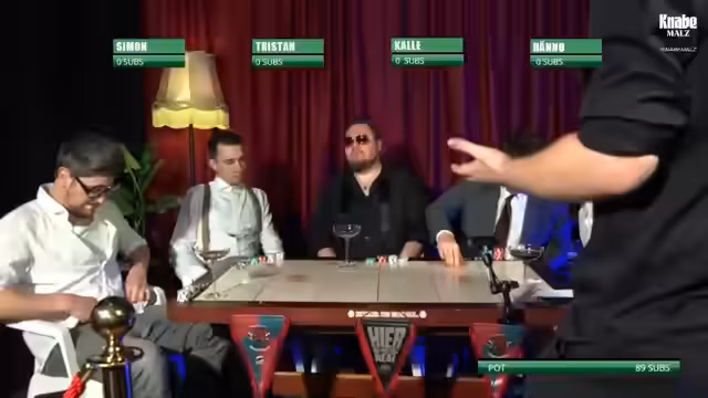 05:54:02Der Stream beginnt mit allererster Folge von Game Poker. Teilnehmer sind Hand of Blood, Karl Koschinski, Tristan Schrage, Power of Evil und Simon Kretschmer. Es wird erklärt, dass mit Gaming-Wissen und Skills gepokert wird, anstatt mit Karten. Nach und nach werden Hinweise zu einem Spiel aufgedeckt, nach denen die Teilnehmer setzen können. Der Einsatz sind Sub-Gifts, und Small Blind sowie Big Blind werden von Runde zu Runde erhöht. Das Ziel ist, bis zum Ende im Spiel zu bleiben und den größten Chip-Stapel zu haben.