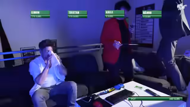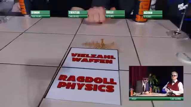 08:13:27Das Feld hat sich auf zwei Spieler, Tristan und Simon, verengt. Im direkten Duell wird ein weiteres Spiel gesucht. Der Hinweis "Highscore erzielen" und "eSport ready" führt zu einem wilden Gebot, bei dem Simon auf Tony Hawk's Pro Skater 1+2 tippt. Tristan, der das Spiel als alt und unattraktiv ansieht, foldet. Simon gewinnt daraufhin einen riesigen Pott von 120 Gifted Subs quasi ohne Gegenwehr.
