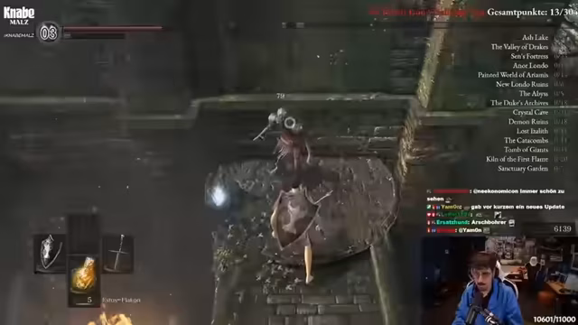 03:39:51Es wird die Situation bei Fischkop live kommentiert, der nervös ist, und die Spandauer Elite wird gelobt. Die Umsetzung von Takeshi's Castle mit den Features, die direkt zeigen, welcher Run live ist, wird als gelungen hervorgehoben. Puzzle wird für seine Leistung gelobt. Es wird eine kurze Zusammenfassung des Vortags gegeben, an dem der Streamer aufgrund seiner Performance und Taktik bei Soulkeepers enttäuscht war und in die Eistonne musste. Er hatte höhere Erwartungen an sich selbst, da der Testrun gut lief, der entscheidende Run jedoch nicht. Am meisten störte, dass es gefühlt die letzte Chance war, Dark Souls 1 in diesem Format durchzuspielen. Um das Trauma zu bewältigen, hat er sich entschieden, Dark Souls 1 als No-Death-Run durchzuspielen. Er kündigt an, dass er jetzt Dark Souls 1 durchspielen will, ohne zu sterben, und dass dies eine Art Traumabewältigung für ihn ist. Der Chat wird einbezogen und es wird über die rote Schrift und die No-Death-Run-Challenge gesprochen.