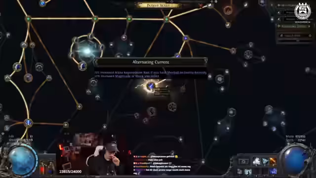03:17:31Der Streamer jongliert permanent mit seinem Mana, weshalb er die Frostwelle seltener einsetzen kann. Er entscheidet sich für eine grundlegende Umstellung des Builds: Er skilt auf Chaos Inoculation, was ihn immun gegen Chaos-Schaden macht, und legt alle einzigartigen Ausrüstungsstücke ab. Sein Fokus verlagert sich komplett auf Energy Shield und er versucht, alle Resistenzen zu maximieren. Gleichzeitig wechselt er komplett vom Crit-Build auf einen Lightning-Build mit dem Ziel, Gegner durch Schocks zu schädigen und seinen Schaden zu erhöhen.