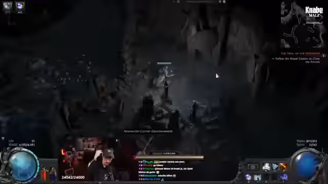 02:08:17Nach anfänglichen Schwierigkeiten mit dem 'Elemental Invocation'-Skill, der verbuggt zu sein scheint, beginnt der Streamer intensiv an seinem Feuermagier-Build zu tüfteln. Er testet verschiedene Perks, 'Support-Gems' und Tränke, um sein Mana- und Energie-Problem zu lösen. Er konzentriert sich darauf, den Schaden zu maximieren und den Spielfluss zu verbessern, während er im Chat mit der Community über mögliche Upgrades und die richtige Skill-Reihenfolge diskutiert.