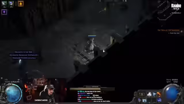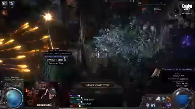 04:44:57Nach einem erfolgreichen Kampf gegen einen Map-Boss möchte der Streamer unbedingt seine nächste Ascendancy-Klasse freischalten, da er spürt, dass dies seinen Schaden erheblich steigern wird. Er erwähnt, dass ihm zuvor durch einen Server-Verbindungsabbruch seine gesamte Ehre verloren gegangen ist. Seine Kombination aus Frostwand, Kometen und anderen_triggered_ Zaubern erweist sich als sehr effektiv, um die Bosse schnell auszuschalten.