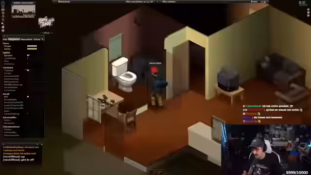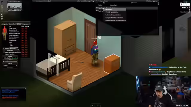 07:21:41Der Streamer nutzt das Lesen von Büchern, um den Erhalt von Erfahrungspunkten zu maximieren. Er beginnt gezielt mit dem Abbau von Möbeln wie Stühlen und Tischen in einem leerstehenden Nachbarhaus. Durch diesen Prozess sammelt er wertvolle Ressourcen wie Holz und steigert seinen Tischlerei-Skill, was ihm den Spitznamen 'Bob der Baumeister' im Chat einbringt.