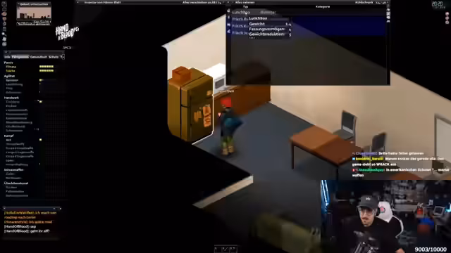 07:14:42Der Charakter öffnet sich für Tipps von Zuschauern und erhält Ratschläge zu verschiedenen Aspekten des Spiels, wie z.B. das Finden einer Digitaluhr, das Sammeln von Müllsäcken und das Lesen von Magazinen. Er plant, die Fenster zu vernageln, um seine Basis zu sichern, und überlegt, die Piets auf dem Server zu besuchen. Es wird diskutiert, dass irgendwann der Strom und das Wasser abgestellt werden und man sich vorbereiten muss. Er liest das Buch über Tischlerei fertig und freut sich über den EP-Bonus. Es wird überlegt, ob Desinfektion und Alkohol in Badezimmern zu finden sind. Der Charakter stellt fest, dass er Tischlereiband 1 gelernt hat und einen EP-Bonus erhält, wenn er tüschlet. Er zersägt Stühle, um seine Tischlerfähigkeiten zu verbessern, und überlegt, einen Generator zu holen. Es wird festgestellt, dass das Spiel für Rentner geeignet ist, da es viel Zeit und Geduld erfordert, um Fortschritte zu erzielen.