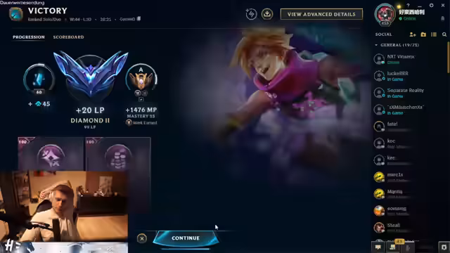 07:36:10Der Streamer konzentriert sich auf den Wettbewerb um den Rang 'Master'. Er erwähnt, dass ihm 81 LP zum Abschluss fehlen und er schätzt, dass er etwa fünf Siege benötigt, da er mit Plus- oder Minuspunkten rechnet. Trotz einer kurzen Pause im Gameplay, um einen anderen Streamer zu raiden, ist der Fokus klar auf den Ranglistenfortschritt gerichtet. Der Stream endet mit einem herzlichen Gruß an die Zuschauer, die sich an der League of Legends-Aktion beteiligt haben, und kündigt für den nächsten Tag einen Entspannungs-Stream an.