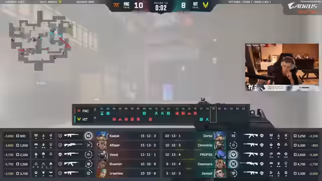 00:08:08Es finden ausführliche Diskussionen über Spielzüge und Taktiken statt. Beispielsweise wird die Notwendigkeit eines zweiten Initiators und eines zweiten Controllers auf der Map Breeze erwähnt. Beim Spiel von Vitality gegen Fnatic auf Split werden die Map-Picks und Veto-Strategien analysiert. Fnatic wird als Favorit auf Breeze angesehen, während Split als einfache Map mit einer klaren Priorität auf die Double-Duelist-Komposition gilt. Auch der Einfluss von Alpha auf der Räse und Kayaks bisheriges Formjahr werden besprochen.
