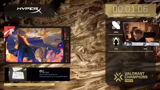 07:28:16DRX gelingt es, mit einem neuen Meta-Read das Match gegen G2 auf die dritte Map, Bind, zu zwingen. Trotz eines starken Comebacks von G2 auf Abyss zeigt DRN ihre Widerstandsfähigkeit. Kommentatoren loben DRXs Anpassungsfähigkeit und strategische Tiefe, insbesondere die schnelle Reaktion auf die G2-Kammer-Komp. Das Set steht nun 1-1 und die Spannung steigt, wer den Sieg im letzten Satz davonträgt.