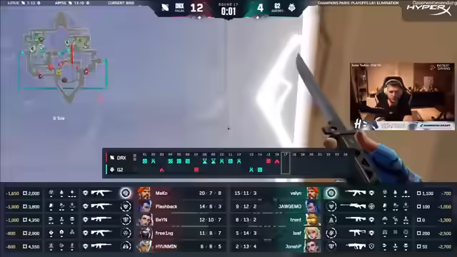 08:00:35Es wird überlegt, ob es einen "Bye Bye G2"-Post geben wird, falls G2 verlieren sollte. Es wird betont, dass G2 dieses Pistol-Round gewinnen muss, um eine Aufholjagd zu starten. DRX führt die Serie mit 4:1 in Pistol-Rounds an. Es wird kommentiert, dass ein Game 3 wiederholt werden musste. Es wird festgestellt, dass DRX als Pacific's 94-Turnier gekommen ist. Es wird die Frage aufgeworfen, ob Links' Leistungen bei diesem Champions-Turnier eine Katastrophe waren. Es wird die gute Mentalität von G2 gelobt, die Chance nicht abzugeben. Es wird die Bedeutung von Trents Tayloreinsatz hervorgehoben und festgestellt, dass dies einen großen Unterschied gemacht hat. Es wird erwähnt, dass DRX ihr erstes Time-out auf der Map nimmt.