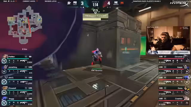 07:14:36Das Spiel zeigt starke Schwankungen im Momentum. Nach einer knappen Runde, die Paper Rex gewinnt, schlägt die Stimmung um. Fnatic wird auf den Rückfuß gedrängt, während Paper Rex an Selbstvertrauen gewinnt. Spieler wie Kayak und Something werden für ihre starken Einzelleistungen gelobt, die es dem Team ermöglichen, sich aus schwierigen Situationen zu befreien und das Spiel wieder offen zu gestalten.