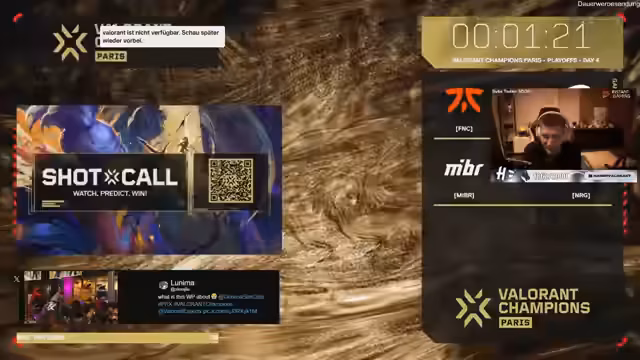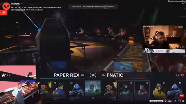 07:46:41Ein intensives VCT-Spiel wird kommentiert, bei dem Teams wie Paper Rex und Fnatic um den Sieg kämpfen. Kommentatoren sind beeindruckt von den späten Runden und Comebacks, besonders als Fnatic die Runde dreht. Die Spannung steigt, als Fnatic mindestens den dritten Platz bei den Champions sicher scheint. Spieler wie Aspas und Brock werden für ihre individuellen Leistungen gelobt und bringen viel Action ins Spiel.