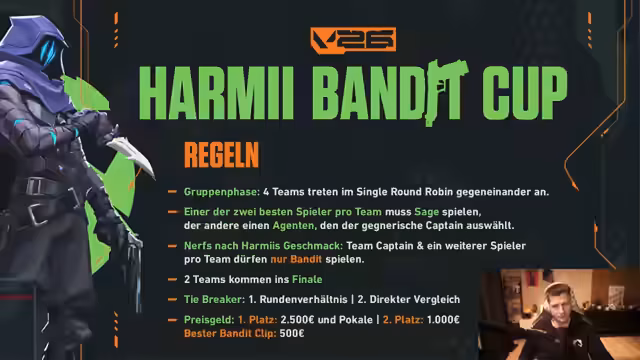 00:04:51Die Team-Captains treffen sich und es gibt intensive Diskussionen über die Teamzusammensetzung. Der Captain Seabor ist unzufrieden mit seiner Teamzuteilung. Wichtige Regelungen für das Turnier werden erläutert. Jedes Team muss einen High-Rank-Spieler in der Emo 3 Radiant haben. Für den besten Bandit-Clip gibt es eine zusätzliche Belohnung von 500 Euro. Die Spieler Attix und Sane haben spezielle Einschränkungen: Attix darf keine Vandal, Phantom oder Operator spielen, und Sane hatte einen Nerf, der jedoch aufgehoben wurde.