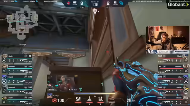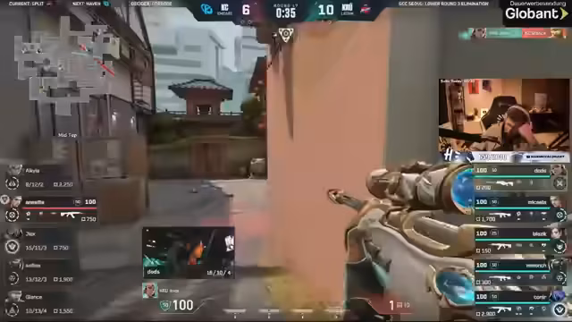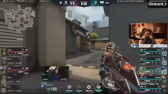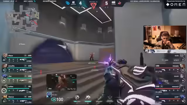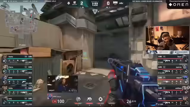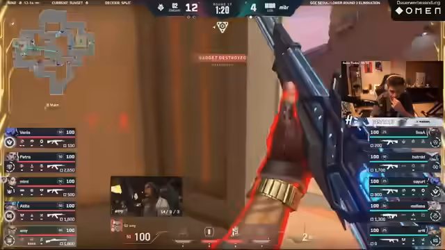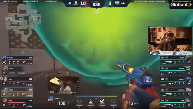 01:43:37M.I.B.R. zeigt eine starke Leistung, indem sie geschickt ihre Zeit abwarten, während Paranoia vorrückt und eine Wand durchbrochen wird. Sie halten ihre Position im hinteren Bereich fest, während Amy einen entscheidenden Kill erzielt. G2 befindet sich in einer sehr unangenehmen Lage innerhalb des Rauchs und zögert, sich in den hinteren Bereich zu teleportieren, was sich als zu riskant erweisen könnte. M.I.B.R. hat nun einen zahlenmäßigen Vorteil und kontrolliert weiterhin den hinteren Bereich. G2 hat Schwierigkeiten, den Spike zu platzieren, es sei denn, Amy gewinnt jeden einzelnen Kampf. Versace erzielt einen dritten Kill, und M.I.B.R. sichert sich diese Runde. Die Situation für G2 ist kritisch, da sie unter Druck stehen und M.I.B.R. die Kontrolle über das Spielgeschehen innehat.