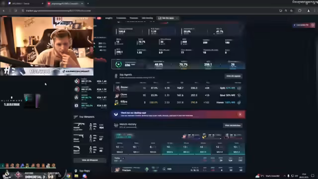 01:39:11Während eines weiteren Ranked-Spiels auf der Map Lotus ist harmii sichtlich frustriert über die Spielweise des Gegners. Er unterstellt, dass der Gegner einen Cheater namens Tensents im Team hat, der unerklärliche Peek-Manöver zeigt. Außerdem wird das Thema Cheater im Spiel angesprochen und die Hoffnung geäußert, dass ab der neuen Saison im März bei einem Bann des Cheaters der verlorene Rangpunkt zurückgegeben wird.