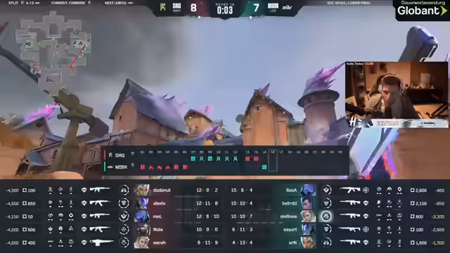 00:04:15Das Hauptevent beginnt mit dem Duell zwischen SRG und MIBR, wobei sich SRG als favorisiertes Team für den dritten Titel präsentiert. Kommentatoren und Chat spekulieren über Map-Vetos und die Spielweise. Während der Runde wird eine technische Panne im Stream erwähnt, bei der fälschlicherweise das Replay der ersten Runde anstelle der aktuellen gezeigt wird. Das Gameplay selbst wird intensiv analysiert, mit Fokus auf die Map-Strategien, insbesondere auf Haven und Bind, sowie die Entscheidungen der Coaches und das aggressive Play von SRG.