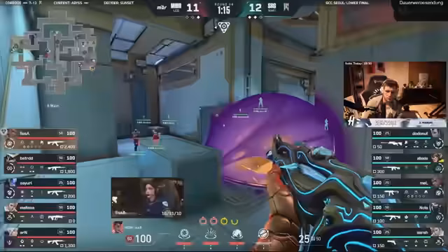 03:07:27Die Spannung steigt, da die Teams im Gleichstand sind und nur noch eine Map für den Einzug ins Finale fehlt. Ein mögliches Rematch für MIBR gegen Team Liquid oder ein Comeback für Shopify Rebellion, die als zweifache Champions erwartet wurden, wird thematisiert. Die Komposition von MIBR mit Doppel-Duellisten wird als sehr stark hervorgehoben, wobei viele Teams ohne Sentinel spielen und Viper oft diese Rolle übernimmt. Die Bedeutung der individuellen Spielerleistungen wird betont, insbesondere die von Lisa, deren Spielweise als 'astute' beschrieben wird. Das Grand Final ist für den nächsten Tag angesetzt, wobei der Gewinner dieses Matches gegen Liquid antreten wird. Die Diskussion über den Streamer-Modus und die Verzögerung des Streams zeigt die Interaktion mit der Community, während gleichzeitig die taktischen Entscheidungen der Teams analysiert werden, wie MIBR eine Free Anti-Eco durch eine korrekte Vorhersage gewinnt.