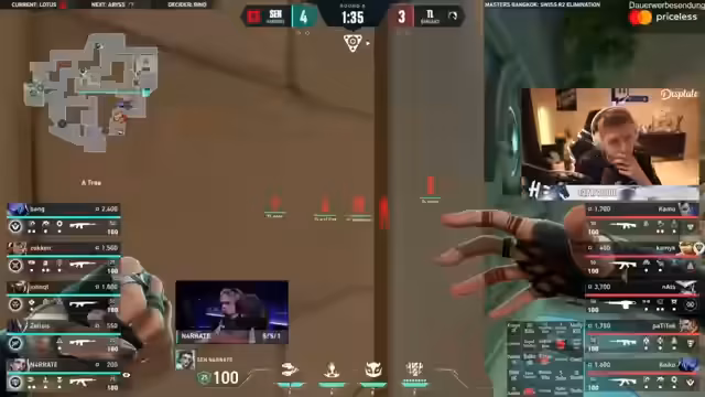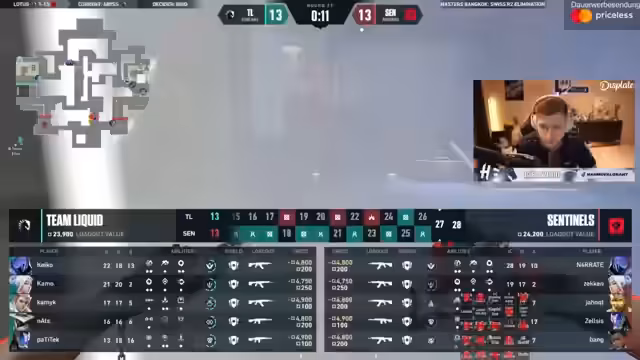 04:10:47Team Liquid erreicht Matchpoint, verliert die Runde jedoch durch Fehler wie das mehrmalige Durchdringen von Smokes, was als Pech und schicksalhaft beschrieben wird. Die Reaktion im Stream ist geprägt von Enttäuschung über das verlorene, aber als "E-Sports" und "geiler Hype" bezeichnete Spiel.