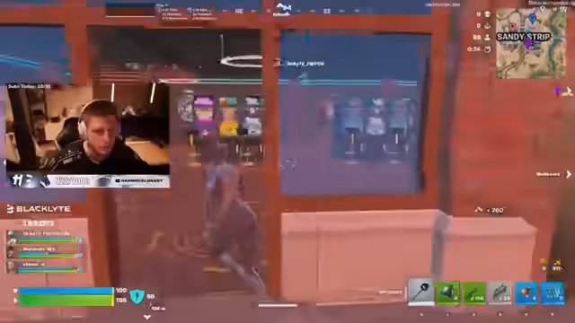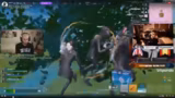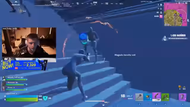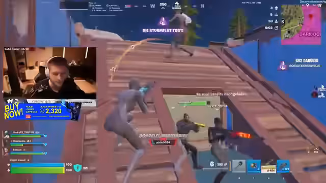 03:26:54Das Stream-Team konzentriert sich auf vorsichtige Bewegungen und zirkuläre Positionen in der Fortnite-Karte. Sie schießen mit Pumpe und Impuls auf vermeintliche Gegnerpositionen in Buschwerk und auf einem Bunker, ohne jedoch direkte Treffer zu erzielen oder Gegner auszuschalten. Die Kommunikation ist auf Teamzusammenhalt und das Finden besserer Schusspositionen ausgerichtet, was jedoch zu einem langsamen Vormarschen führt, ohne dass eine klare Taktik oder das Erzielen von Schaden deutlich wird.