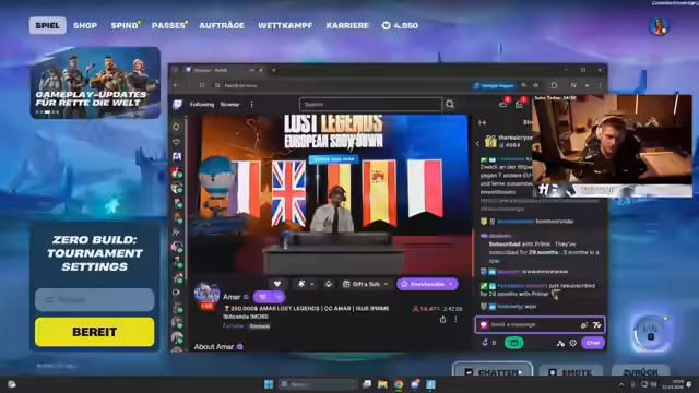 00:03:00Der Streamer beginnt seinen Tag, indem er Aim-Training absolviert und sich auf die bevorstehende Fortnite-Runde vorbereitet. Es wird das große 250.000€-Amar-Turnier angekündigt, an dem er am Abend gemeinsam mit den Profis Kiduu, McKyTV und NiekBeats teilnehmen wird. Der genaue Startzeitpunkt des Turniers ist noch unklar, liegt aber voraussichtlich um 18 Uhr. Der Streamer hat seine Termine verschoben, um an dem Event teilnehmen zu können, und ist gespannt auf den Wettkampf.