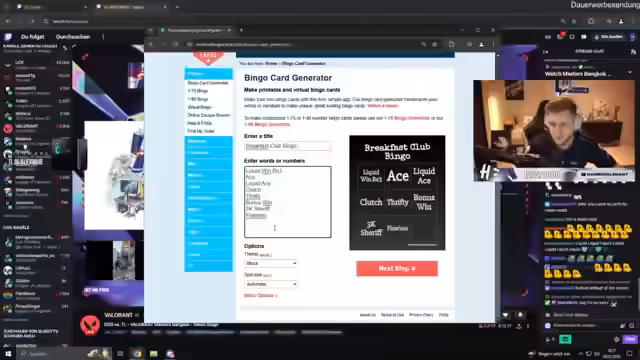 00:00:43Zu Beginn des Streams werden die Zuschauer begrüßt und es wird über den bevorstehenden VCT Masters gesprochen. Der Fokus liegt auf der Organisation der Watch Party für das Spiel zwischen Team Liquid und EDG. Es wird ein Bingo-Spiel für die Zuschauer vorbereitet, um die Veranstaltung interaktiver zu gestalten. Der Streamer diskutiert mit dem Chat über die Bingo-Kriterien und legt ein Liquid-Thema fest, um die Spannung zu erhöhen und die Partei in ein gemeinsames Erlebnis zu verwandeln.
