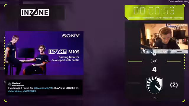 04:19:25Die Kommentatoren analysieren den Halbzeitstand von 2-0 für Liquid. Mini und Stadak vergleichen die Spielstile. Liquid greift direkt an und versteht Vitality’s Spiel perfekt. Vitality hingegen scheint Durkka’s Anleitung nicht zu folgen und spielt zu passiv. Es wird spekuliert, ob Vitality in der zweiten Hälfte „unkonventionelle Picks“ wie Viper oder eine vierte Duelistin versuchen wird, um aus der Mirroring-Map auszubrechen und einen Vorteil zu erlangen.