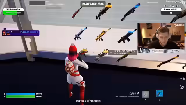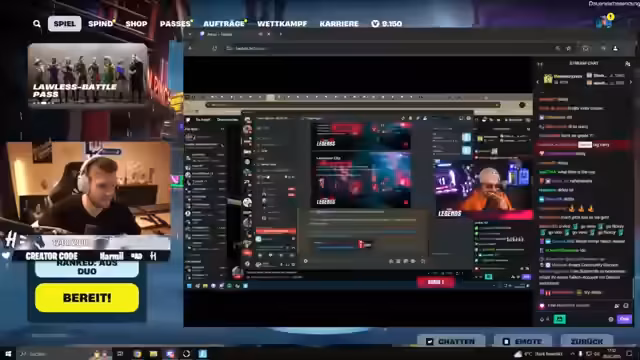 09:39:55Nach dem Neustart des Routers gibt es Probleme mit der Lobby. Es wird überlegt, wie man das Overlay entfernen kann, während gleichzeitig die hohe Anzahl an Fortnite-Streamern während solcher Turniere thematisiert wird. Es folgt eine Diskussion über Skins, wobei die Frage aufkommt, ob bestimmte Skins wie 'stretched' aussehen. Hami kehrt zurück und es wird über die Lobby gesprochen. Es wird überlegt, ob man den Skin wechseln sollte, um nicht so aufzufallen. Der Streamer überlegt, welchen Skin er wählen soll und fragt den Chat nach Rat bezüglich der Skinfarbe, da dunkle Skins bevorzugt werden.
