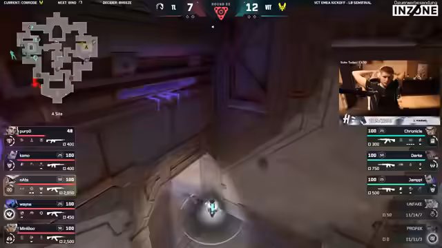 00:59:08Die zweite Map, Bind, beginnt und Team Liquid zeigt ein komplett anderes Gesicht. Sie nutzen eine aggressive Komposition mit Neon und Wave, was sich als sehr erfolgreich erweist. Minibu glänzt mit beeindruckenden Aktionen und ist entscheidend am Sieg beteiligt. Der Kommentator zeigt sich überrascht von der starken Rückkehr von Liquid, die sich von der enttäuschenden Performance auf Ascent erholt. Vitality hingegen wirkt planlos und kann dem Druck nicht standhalten.