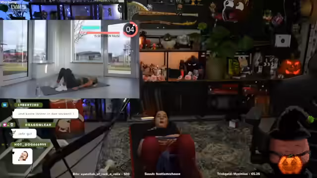 03:21:41Es beginnt ein gemeinsames Bauch-Beine-Po Workout, das die Streamerin mit einer Wasserflasche als Equipment durchführt. Die erste Übung ist ein 'Crunch', bei dem der Oberkörper nach oben gezogen und die Wasserflasche um die Beine gekreist wird. Es wird Wert auf eine korrekte Ausführung gelegt, wie das Einziehen des Bauches, das Anspannen der Bauchmuskulatur und das Anliegen des unteren Rückens auf der Matte. Nach einer kurzen Pause folgen weitere Bauchübungen, darunter 'Hip-Trusts' und 'Side Crunches'. Die Streamerin gibt detaillierte Anweisungen und motiviert die Zuschauer, mitzumachen. Das Workout ist darauf ausgelegt, die Bauch- und Gesäßmuskulatur intensiv zu trainieren und wird als anstrengend, aber effektiv beschrieben.