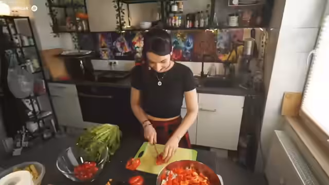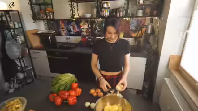 00:36:28Beim Schneiden von Zwiebeln brennen der Streamerin die Augen, woraufhin sie humorvolle, absurde Tipps gibt, um dies zu vermeiden: fünfmal im Kreis drehen, fünf Minuten auf einem Bein hüpfen, einen Marathon laufen, Zwiebeln unter Wasser schneiden, sich selbst ins Wasser stürzen, sich in fünf Minuten trocknen, dabei singen und eine Wäscheklammer auf die Nase setzen – alles gleichzeitig und im Handstand. Sie spricht über die emotionale Bindung zu Zwiebeln und scherzt über 'Zwiebelbärt', eine imaginäre Person. Es wird über frittierte Zwiebeln in Amerika ('Onionbloom') und die Verwandtschaft von Torten und Zwiebeln diskutiert. Die Streamerin gesteht, dass sie unorganisiert ist, was Gefäße betrifft, und nennt es 'sparsam'. Sie vergleicht das Töten von Kartoffeln mit Kannibalismus, obwohl sie selbst keine Kartoffel ist.