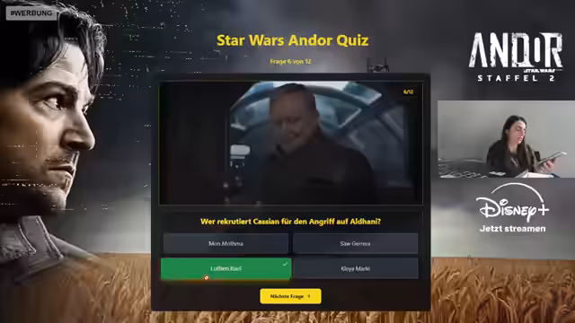 00:21:56Das Quiz mit zwölf Fragen über die Serie "Andor" beginnt, bei dem der Schnellste in den Antworten Punkte sammeln kann. Die erste Frage zielt auf die Hauptfigur ab, gefolgt von einer Frage zur Stellung der Serie im Star-Wars-Kanon. Es treten häufige Verwechslungen mit anderen Serien auf, und der Streamer muss häufig die richtigen Antworten bestätigen und den Ablauf moderieren, während das Publikum eifrig miträt.