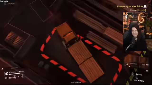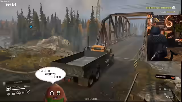 04:43:29Nach SnowRunner als gewonnenes Spiel startet der Stream direkt in die Mission zur Reparatur einer eingestürzten Brücke. Es wird ein geeignetes Fahrzeug gesucht und der Spieler muss einen kleinen Baum fällen, um den Weg freizumachen. Bei der Suche nach der Fracht wird die Steuerung als holprig beschrieben. Nachdem die Holzplannen gefunden sind, stoßen Probleme auf: Die Fracht kann nicht ohne Kran abgeladen werden. Der Streamer ist verwirrt über die Spielmechanik und muss erst das Menü aufrufen, um die Lieferung der Stahlträger für die Brücke zu aktivieren.